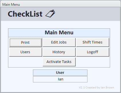 Checklist is one of my first real databases. This was created as a replacement to a similar database that had no one to support it. It contains a list of tasks to be completed at a given time on a given time / day / month. This covers the two 12 hour shifts and is used every day to make sure jobs are completed.